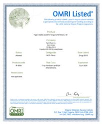 Pescadero Gold Mustard Meal OMRI Certification Safety Data Sheet Nutrient Analysis Heavy Metal Analysis Pajaro Valley Gold 1.0 Organic Fertilizer 2-3-1 OMRI Certification Safety Data Sheet Nutrient Analysis Heavy Metal Analysis