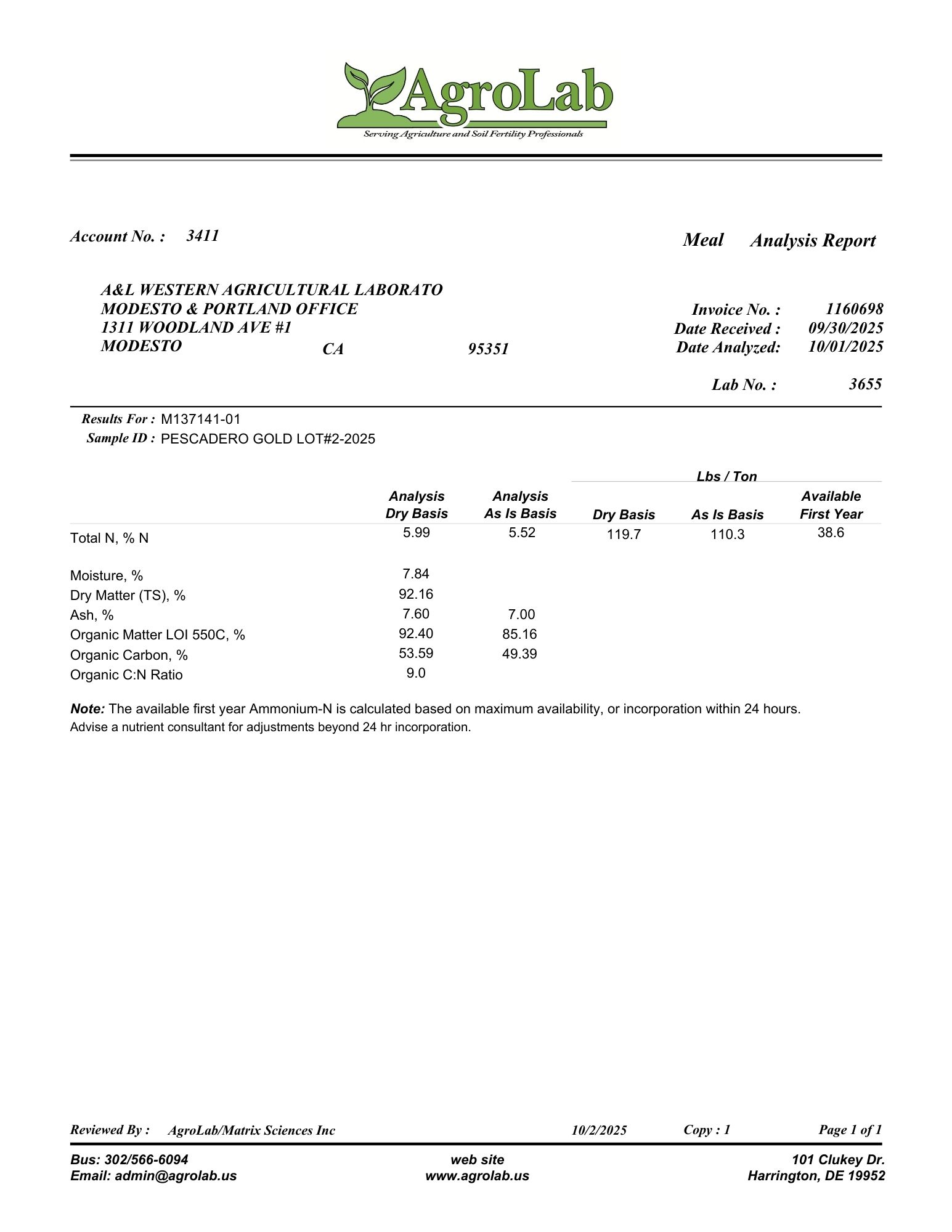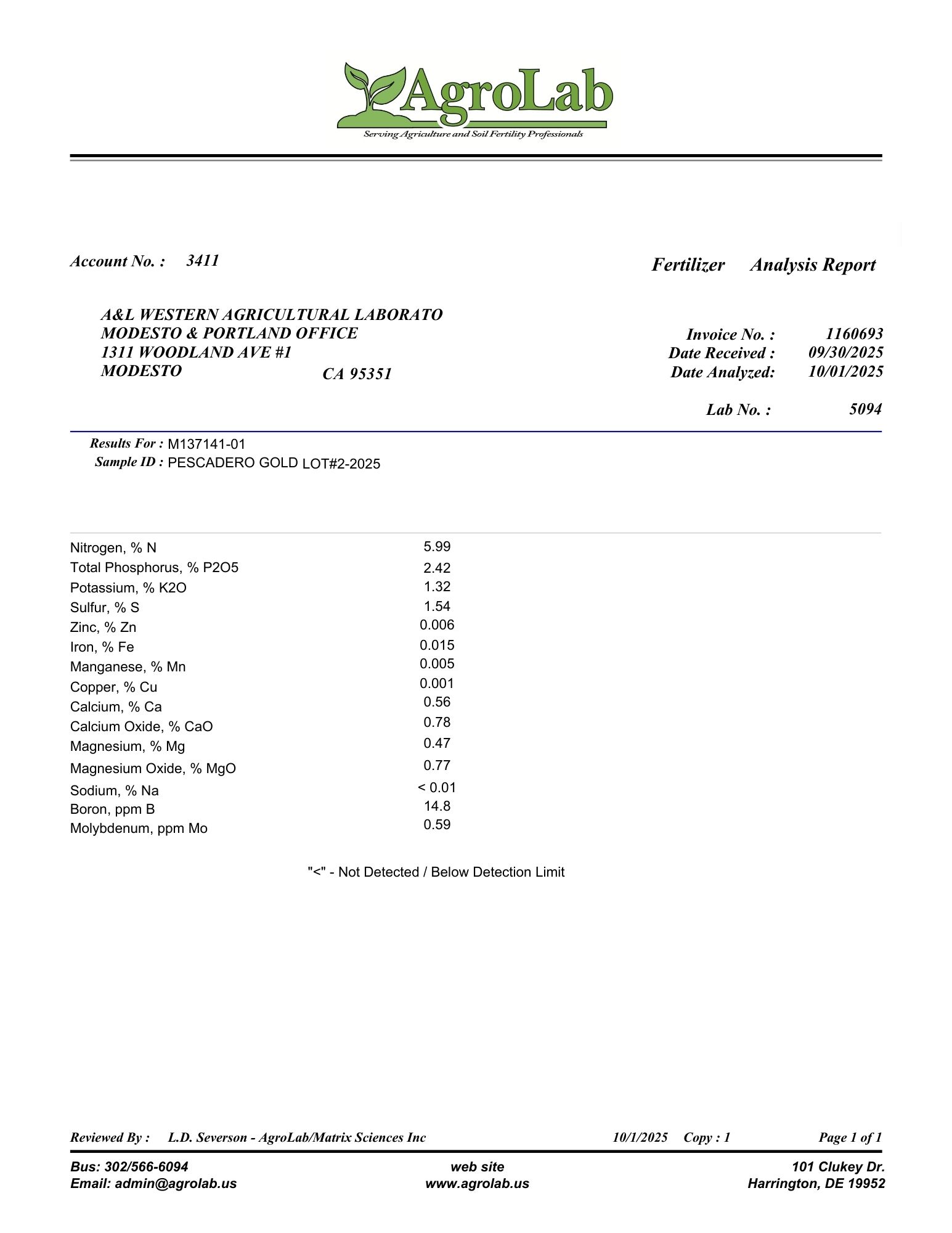 Pescadero Gold Mustard Meal Fertilizer 4.5-1.5-1 is approved for use in organic production. Its formulation is 100% plant-derived making it a great source of organic matter, enhancing the bacterial and fungal communities in the soil. This, coupled with its highly bioavailable nutrient profile drastically improves crop nutrient uptake and overall crop performance. There are no additives or preservatives used during manufacturing. Our product creates a unique, high-quality product that goes unmatched in the marketplace. Pescadero Gold continues to impress growers of all crops throughout North America with its ability to enhance crop performance both in the field and in container production.